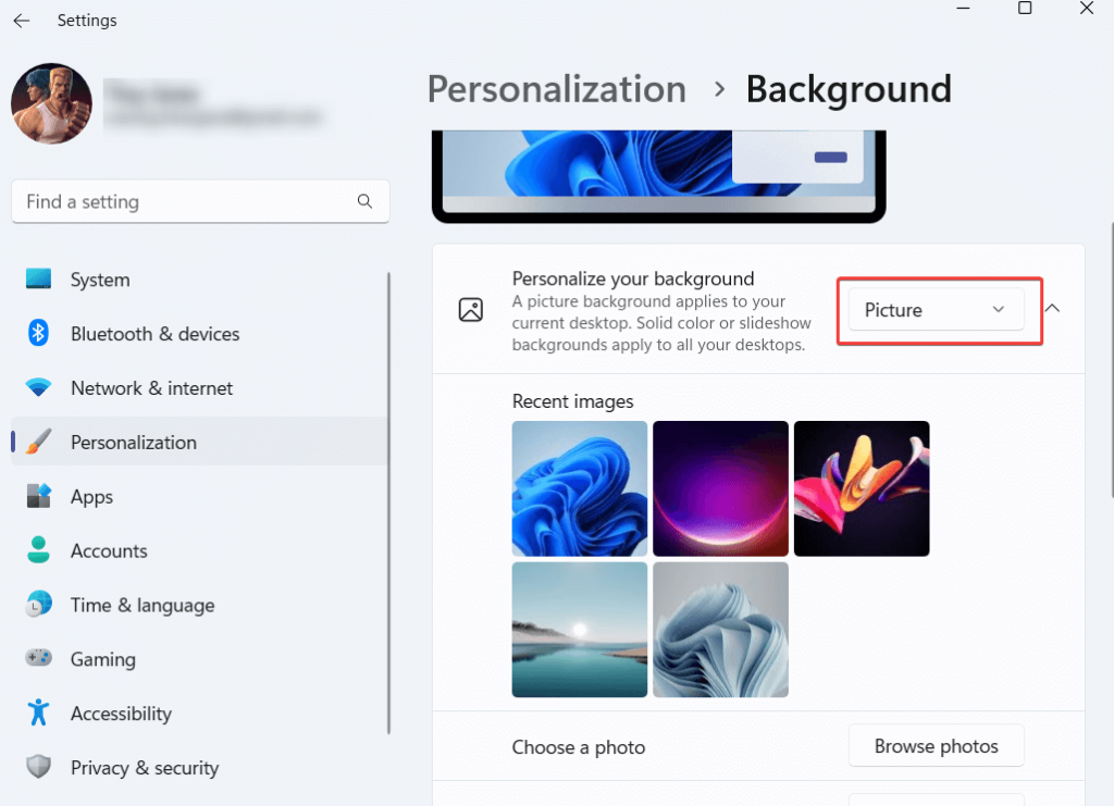 Lehet, hogy a hátterét úgy állította beDiavetítés- A diavetítés néhány percenként megváltoztatja a háttér képét. Itt vannak a kikapcsolás lépéseiDiavetítés-benBeállításokés megakadályozza a háttérkép cseréjét -