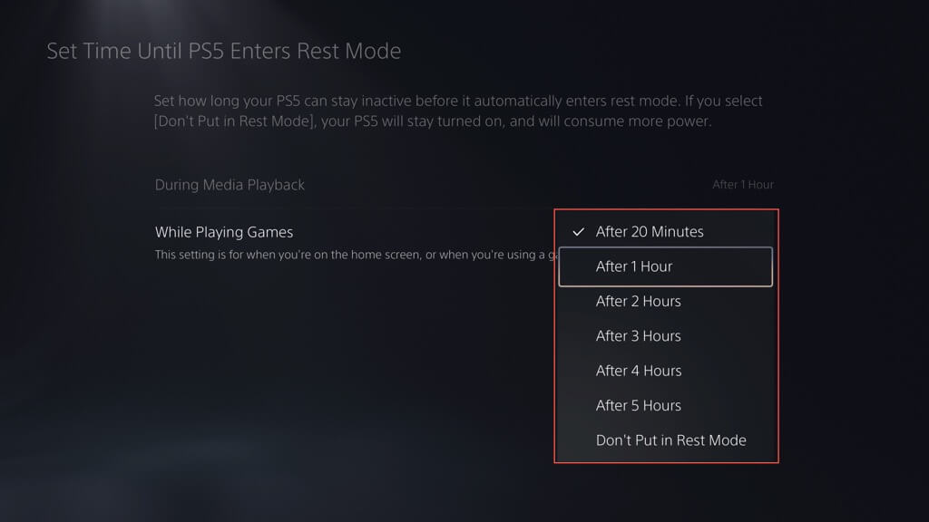 - Válassza ki a kívánt időtartamot, mielőtt a Kezdőképernyőn vagy egy videojátékban vagy alkalmazásban tétlenül lépne be Pihenési módba – a legrövidebb (és alapértelmezett)20 perc után, és ezt növelheti1 óra elteltével,2 óra elteltével,3 óra elteltévelés így tovább.
