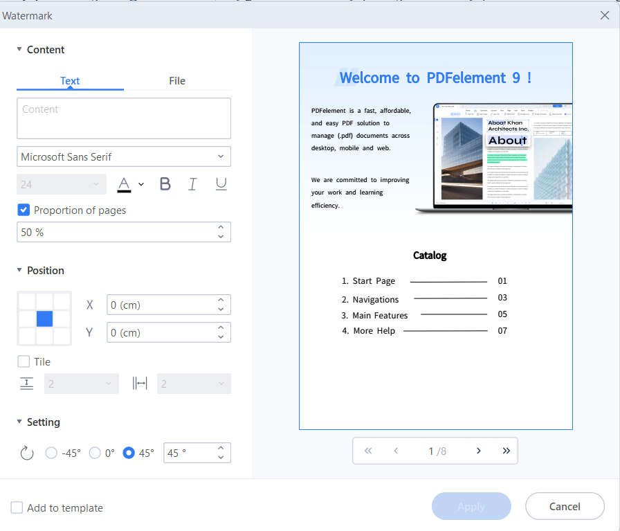 - A következő képernyőn, a jobb oldalon számos lehetőség látható a vízjel hozzáadására. Hozzáadhat szöveget és képeket, megváltoztathatja pozíciójukat a PDF-ben, és módosíthatja az átlátszósági szintet is. Nemcsak ez, hanem kiválaszthatja azt az oldaltartományt, amelyen meg szeretné jeleníteni a vízjelet.