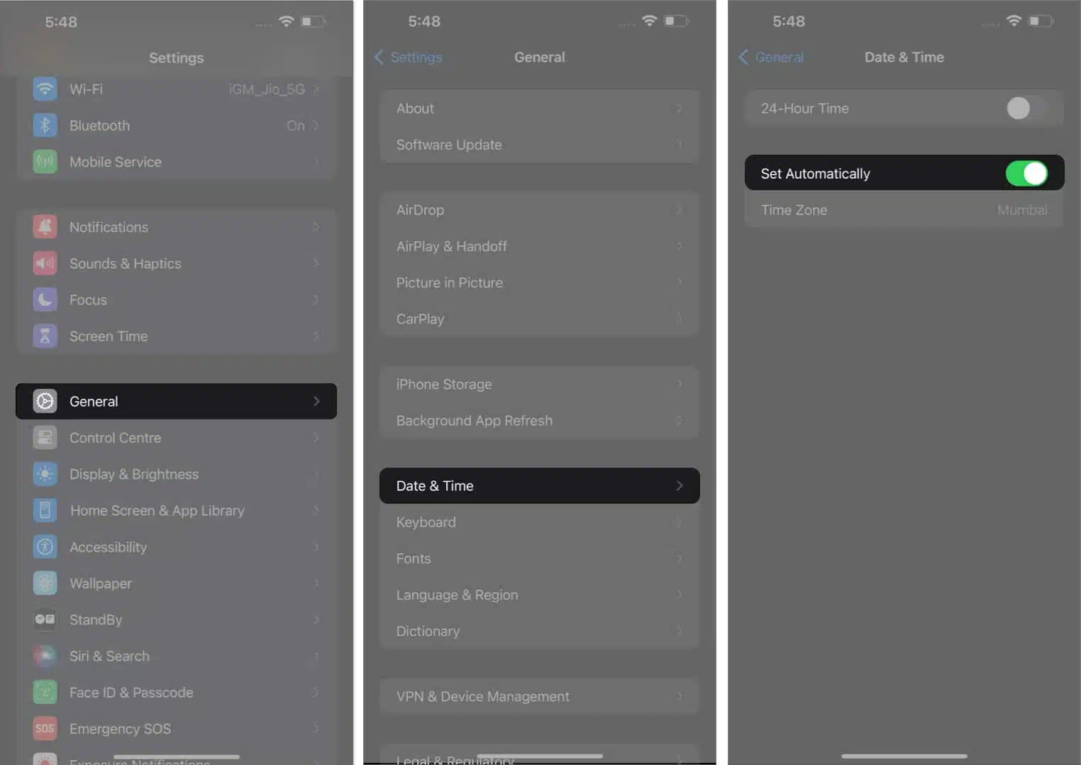 Miután az iPhone újraindult, ellenőrizze, hogy megmutatja -e a helyes dátumot és időt. Ha nem, akkor a riasztások a várt időpontban nem fognak kilépni. Ennek biztosítása érdekében menjenBeállítások→Általános→ Dátum és időváltásAutomatikusan beállítva→ Válassza ki aIdőzóna-