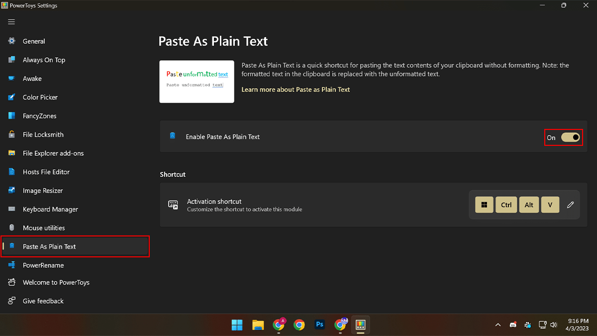 A PowerToys lehetővé teszi a Windows 11 funkcióinak javítását. Ebben az esetben engedélyezheti a billentyűzet parancsikonját a vágólap tartalmának sima szövegként történő beillesztésére. Ami magamat illeti, általában másolom és beillesztem a sima szöveget, hogy ez hasznos legyen a legtöbb felhasználó számára, mivel ez elegendő és könnyen használható.
