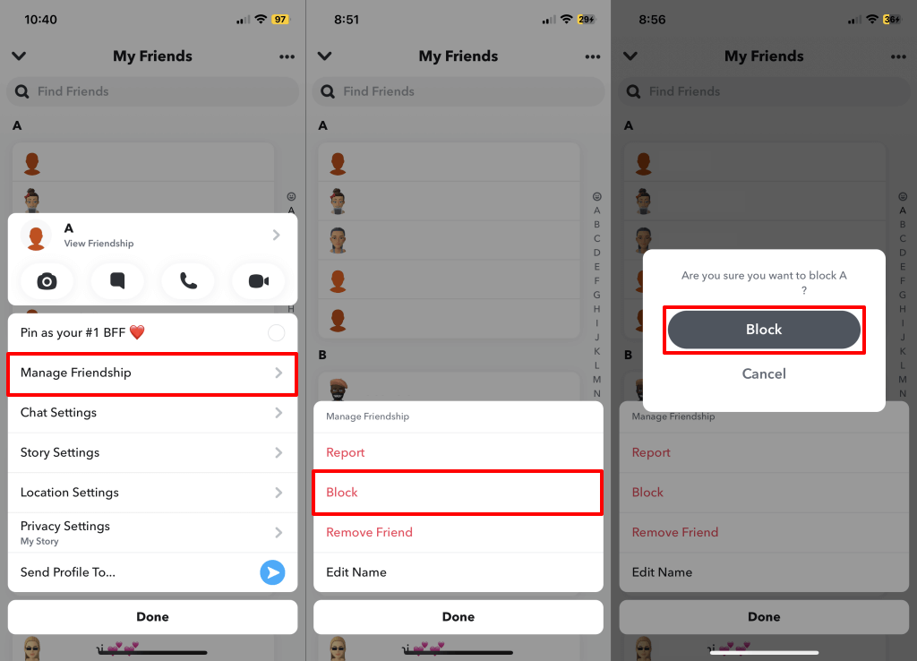 Ha blokkolja valakit a Snapchat -on, eltávolítja őket barátja, legjobb barátja, bestie, bff vagy szuper BFF -ként. Elveszíti a csevegéseit és a Snapchat -csíkokat a blokkolt felhasználóval. Hasonlóképpen, a Snapchat megzavarja őket a történet megtekintéséről, szövegek küldéséről vagy felhívásáról.