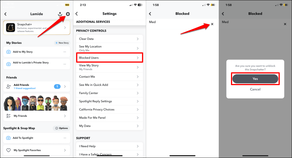 A felhasználó feloldásához nyissa meg a Snapchat profilt, és érintse meg asebességváltó ikona felső sarokban, és válassza kiBlokkolt felhasználók- Érintse meg aX ikonannak a személynek a mellé, akit fel akarja oldani és válasszonRENDBENfolytatni.