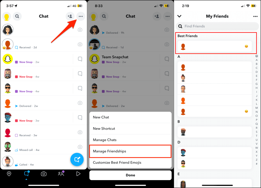 Nyissa meg a Snapchat chat képernyőt, érintse meg ahárompontos ikona jobb felső sarokban, és válassza kiKezelje a barátságokat- A Snapchat megjeleníti a legjobb barátok listáját a „barátaim” oldal tetején.