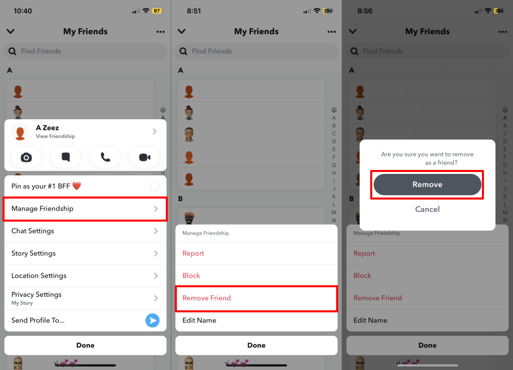 - CsapTávolítsa el a barátotés válasszonEltávolításIsmét a felbukkanó üzenetben.