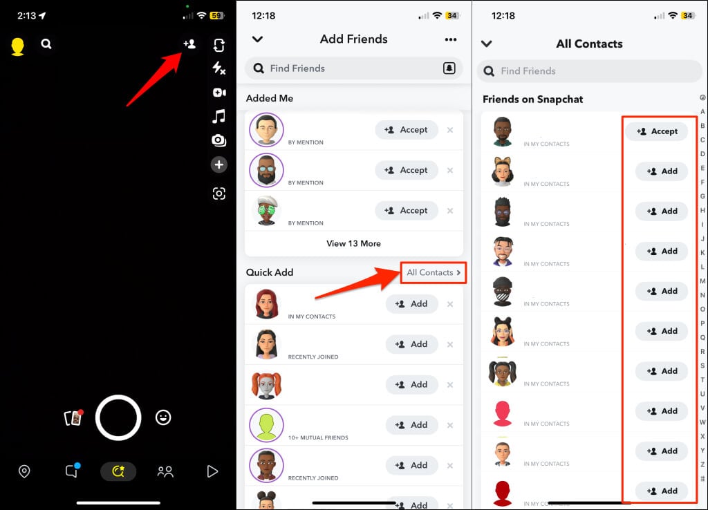 Nyissa meg a Snapchat -ot, és érintse meg aAdjon hozzá barátokatikon a csevegés vagy a kamera képernyő jobb felső sarkában. Ezután válassza kiMinden kapcsolattartóÉs koppintson aHozzáadikon annak a személynek a mellett, akit újra be akar lépni.