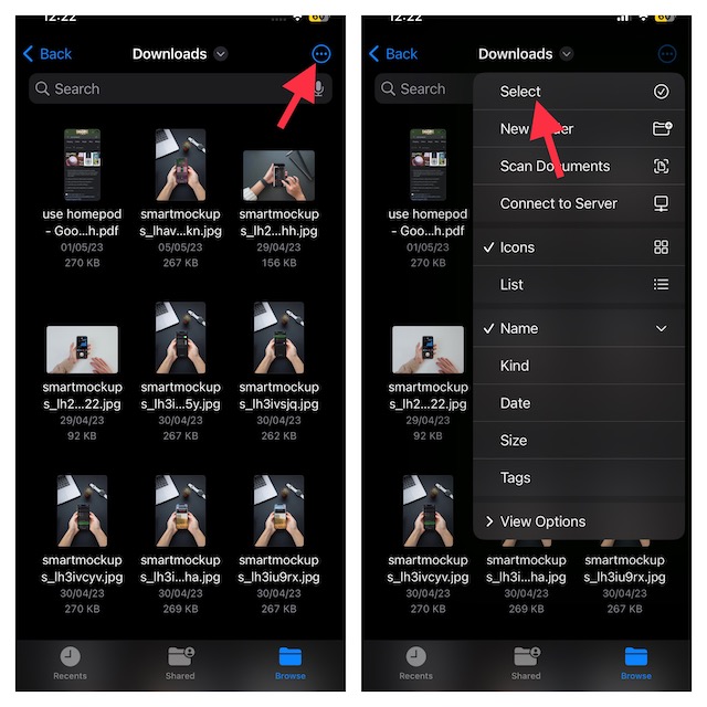 - Az iPhone -on vagy az iPad -en nyissa meg a fájlok alkalmazását az eszközén -> Érintse meg aBöngészfül a képernyő alján ->Letöltésekmappa.