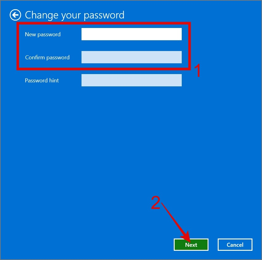 5. lépés:Az új jelszó képernyőn ne írjon be semmit az Új jelszó és a Jelszó megerősítése mezőbe, és kattintson a Tovább gombra.