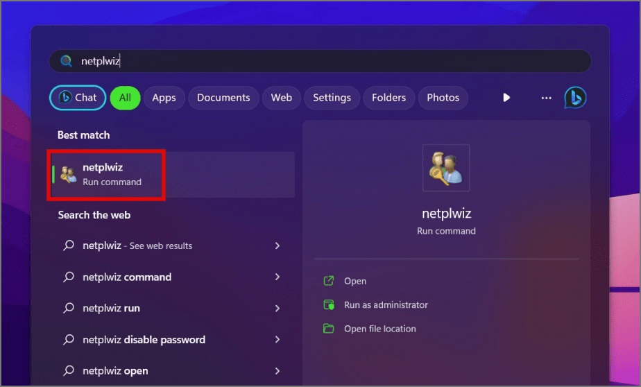 1. lépés:Nyomja meg a Windows + S gombot, majd írja be a „netplwizKattintson a legjobb mérkőzés eredményére.