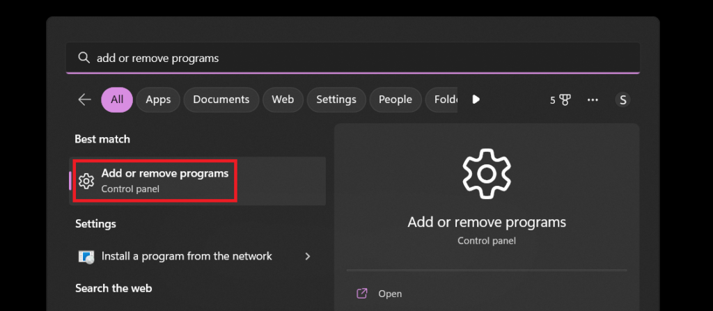 1.Nyissa meg aWindows keresőmező, típusProgramok hozzáadása vagy eltávolításabenne, és válassza ki a keresési eredmények közül.