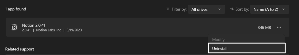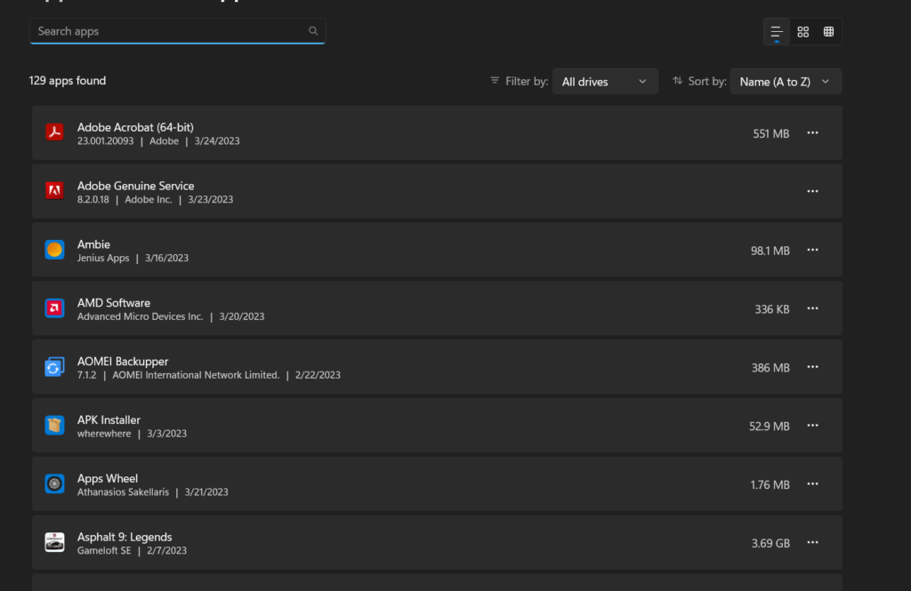 3.Kattintson ahárom pont (…)a program mellett, és válassza ki aEltávolításopciót a legördülő menüből.