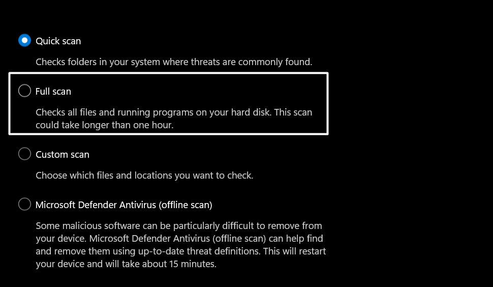Ezt figyelembe véve javasoljukfuttasson le egy részletes víruskeresésta rosszindulatú programokkal vagy vírusokkal fertőzött fájlok megkereséséhez és eltávolításához. Az alábbiakban a Windows Defender Antivirus eszközzel végzett rosszindulatú programok és vírusok kereséséhez szükséges lépések találhatók: