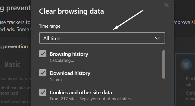 3.Állítsa be aIdőtartománylegördülő menübőlMinden alkalommalés jelölje be az összes jelölőnégyzetet aBöngészési adatok törlésegyors.