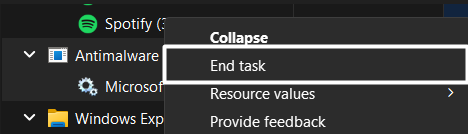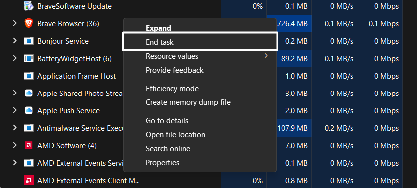 4.Kattintson a jobb gombbal az adott folyamatra ugyanabban a részben, és válassza ki aFeladat befejezéseopciót a jobb egérgombos menüben.