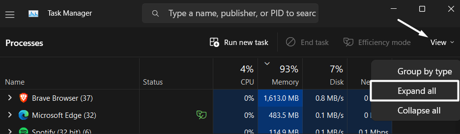 2.Kattintson aKilátásmelletti opcióHatékonysági módés válassza kiAz összes kibontásaa legördülő menüből.