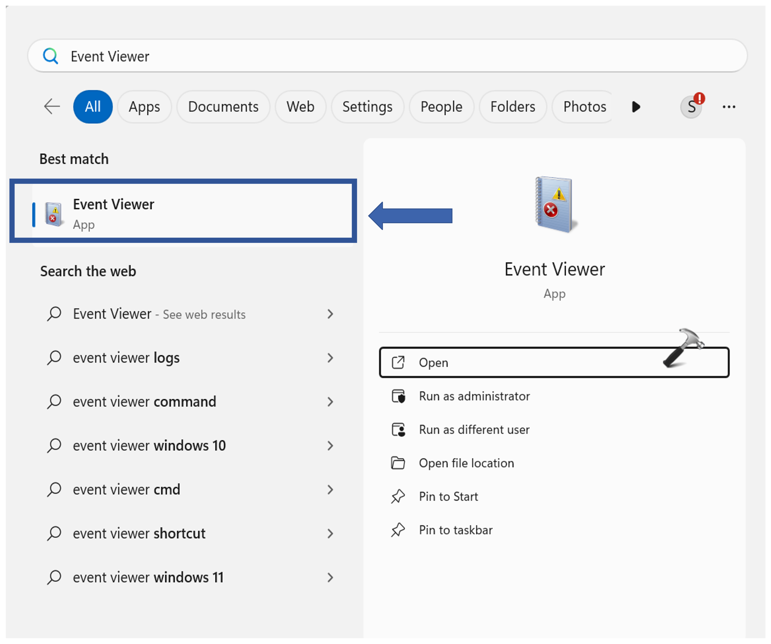 4. Nyissa meg a keresési menüt, és írja be a “Rendezvénynéző„. Nyissa meg az alkalmazást.