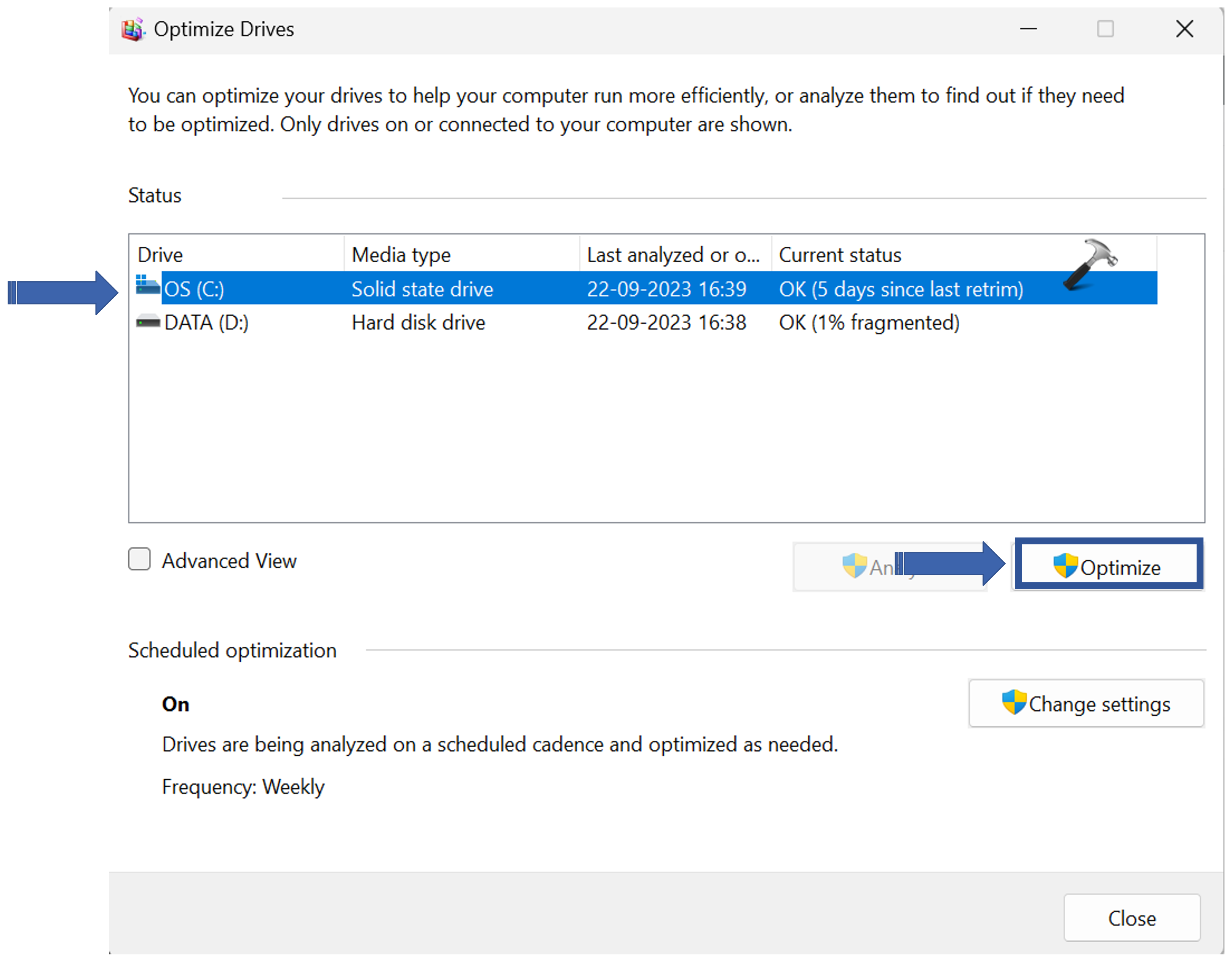 2. Most válassza ki a „(C :)- Vezessen, majd kattintson a "Optimalizál”Opció.
