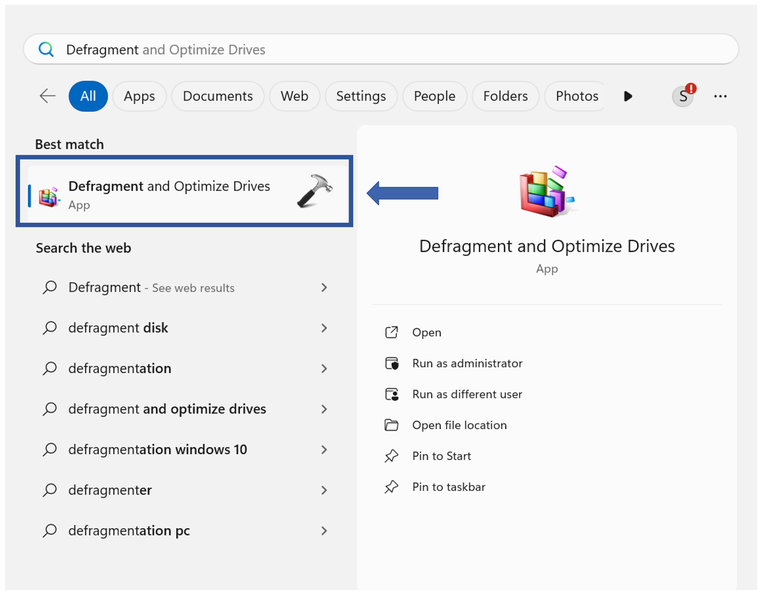 1. Nyissa meg a keresősávot, és írja be a „Fakálódást”. Nyissa meg a „A meghajtók töredesítése és optimalizálása”App.