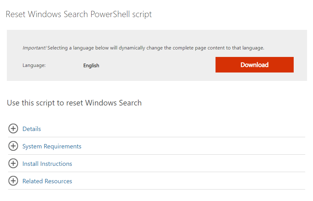 1. lépés:Töltse le aResetWindowssearchbox.ps1PowerShell szkript aMicrosoft letöltési oldal.