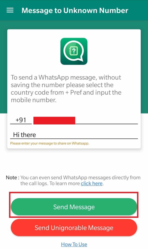 Üzenet ismeretlen számraideális megoldás az üzenetküldéshez a címzett számának mentése nélkül. Ez az egyszerű és felhasználóbarát alkalmazás egy oktatóanyagot tartalmaz, amely segít megérteni, hogyan működik. Ez az alkalmazás sokkal kényelmesebbé teszi az üzenetküldést azáltal, hogy lehetővé tesziegyéni vagy tömeges üzeneteket küldhet tetszőleges számra anélkül, hogy el kellene mentenie elérhetőségeit a címjegyzékbe.