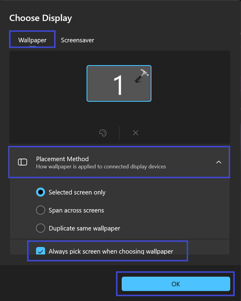 Ellenőrizze a „A háttérkép kiválasztásakor mindig válasszon képernyőt”Ha azt akarja, hogy a rugalmasság minden alkalommal kiválasztja a kijelzőt, amikor háttérképet állít be. Ez az opció csak akkor érhető el, ha aCsak kiválasztott képernyő„Az elhelyezési módszer kiválasztva van.