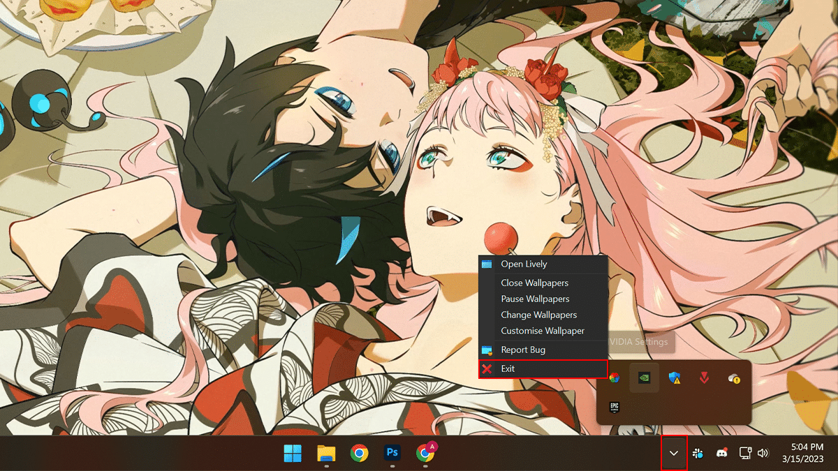 - Kattintson a nyíl ikonra a rejtett ikonok megjelenítéséhez> Kattintson a jobb gombbal aÉlénk háttérképikon>, és kattintson aKijáratopció.