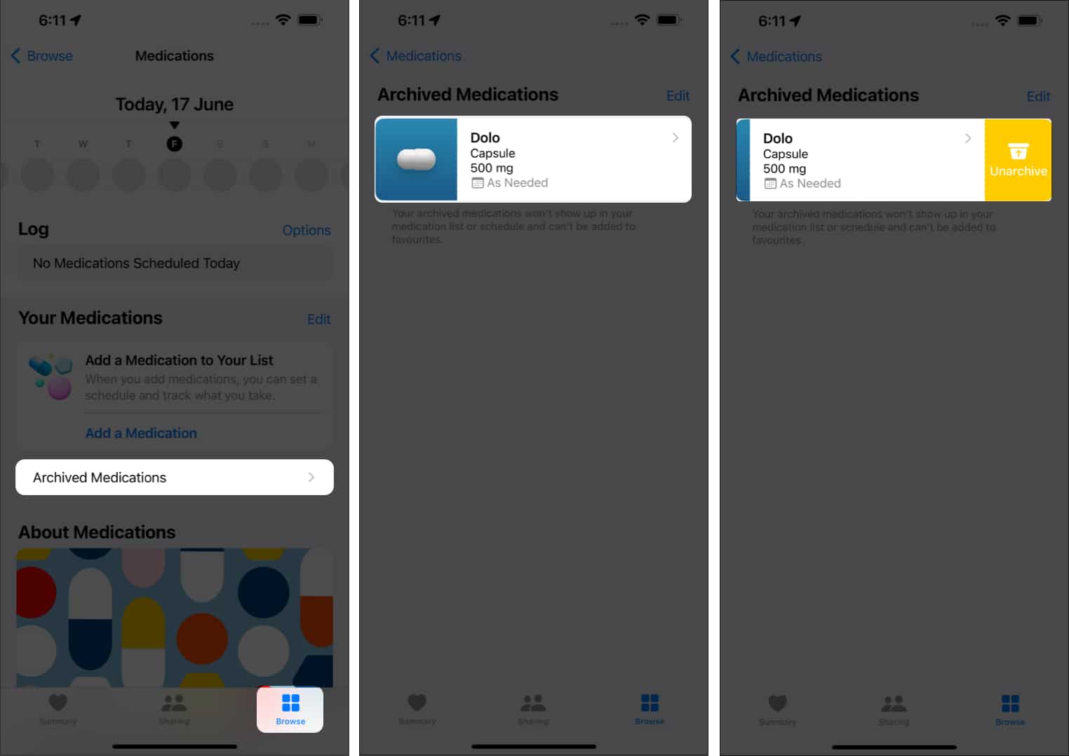 Az Unarchive gyógyszeres emlékeztetőkre: Kövesse a fenti első 2 lépést, válassza kiArchivált gyógyszerek→ Agyógyszer→ Válassza kiFelvonul-