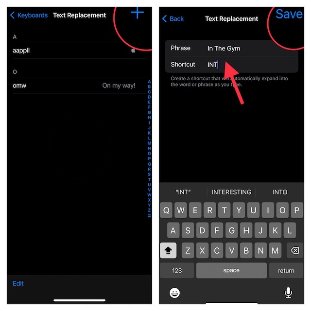 A kezdéshez röviden beszéljük meg a szövegcserét, és azt, hogy miként gyorsíthatja fel a gépelést! Ahogy a név is sugallja, a „szövegcsere” célja a gépelés felgyorsítása. Miután létrehozott egy szövegcsere-parancsikont, az eszköz billentyűzete automatikusan beírja a teljes mondatot a billentyűparancs bevitelének pillanatában. Például létrehozhat egy „INT” parancsikont az „In The Gym” beírásához.