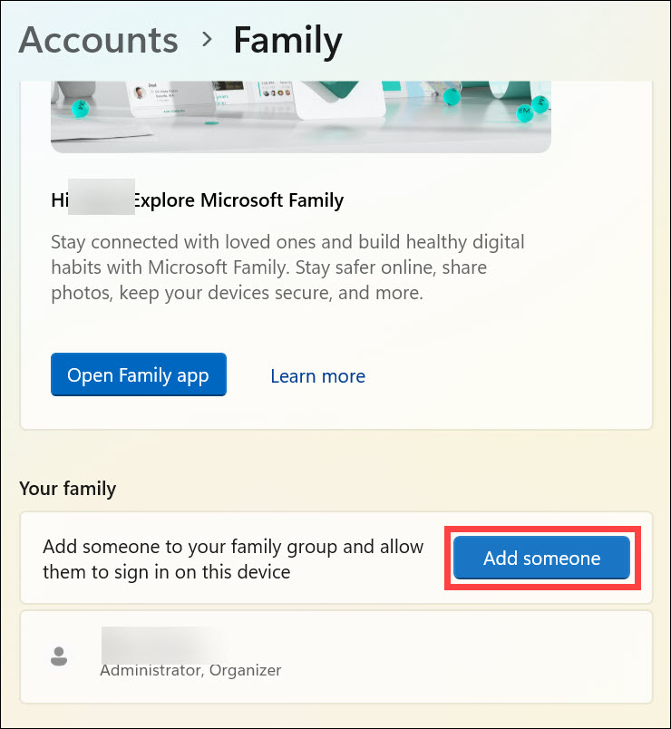 3.A következő oldalon, a „Család” címe alatt kattintsonAdj hozzá valakitgomb.