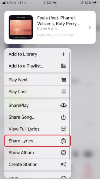 - Ezután hosszú nyomja meg a dalt, és érintse megShare Lyrics-