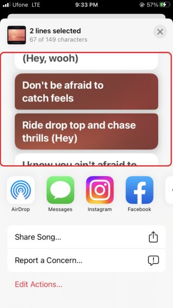 - Válassza ki a megosztani kívánt dalszövegeket, több sort oszthat meg, mindaddig, amíg azok illeszkednek a 149 karakteres határon.