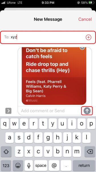 - Ezután érintse meg az üzeneteket a megosztási lapból> Adja hozzá azt a kapcsolatot, amelyre elküldheti a dalszövegeket, és nyomja meg a Küldés gombot.