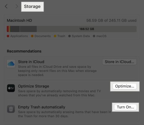 Megmentheti a tárolóhelyét isRendszerbeállítások- ElindulÁltalánosés válasszonTárolás- Itt kattintsonOptimalizálA nézett filmek és TV -műsorok eltávolításához. Engedélyezheti isAutomatikusan ürítse ki a kukát-