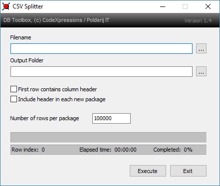 CSVSplitter filename="C:Portablestechindroid.csv" outputfolder=" C:Portables" rowcount=10000 firstrowheader=1 repeatheader=1