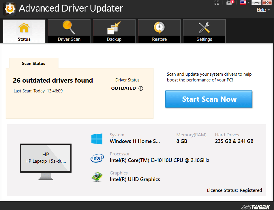 Az illesztőprogramok Eszközkezelőn keresztüli manuális frissítésének folyamata meglehetősen hosszadalmas, mivel minden illesztőprogram-frissítést ellenőriznie kell a Windows Serveren vagy a hivatalos webhelyen. Azt javasoljuk, hogy használjon illesztőprogram-frissítő programot, amely néhány egérkattintással átvizsgálja, azonosítja, letölti és telepíti az új illesztőprogramokat a számítógépére. Az egyik ilyen alkalmazás az Advanced Driver Updater, amely megtalálja az illesztőprogram-rendellenességeket a számítógépén, például a sérült, hiányzó és elavult meghajtókat, és kijavítja az összes illesztőprogram-problémát. A következőket kell tennie: