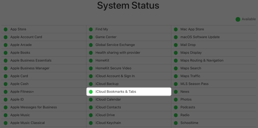 Mielőtt az eszközök különféle lépésein átmenne, ellenőrizze aApple rendszer állapotoldala- Zöld fényt fog látni melletteicloud könyvjelzők és fülekHa minden rendben van.
