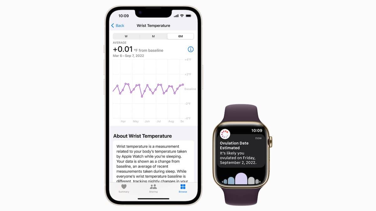 Az Apple Watch Series 8 vagy Apple Watch Ultra a csukló hőmérsékleti adatait használja a kétfázisú eltolódás észlelésére, amely a hőmérséklet emelkedése, amely gyakran előfordul az ovuláció után. A fejlett algoritmusok a csukló hőmérsékleti adatait és a naplózott ciklusadatokat használják az ovuláció várható napjának becsléséhez.
