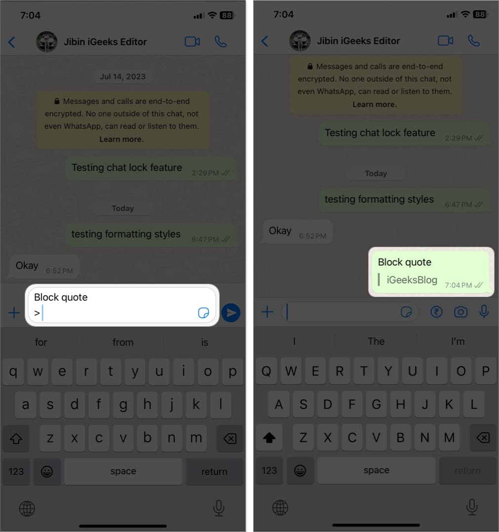 Például az iGeeksBlog beírásához a WhatsApp Inline kódjában írja be a ` karaktertiGeeksBlog`Jegyzet:Ha iPhone-on backticket szeretne beírni, nyomja meg hosszan az idézőjel billentyűt. (')