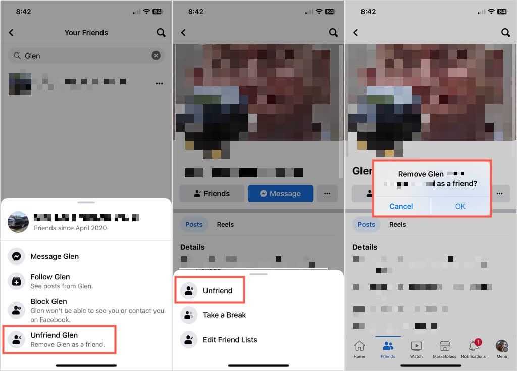 - Érintse meg ahárom ponta személy nevétől jobbra, és válassza kiBarátság megszüntetése [név]a felugró menüben.