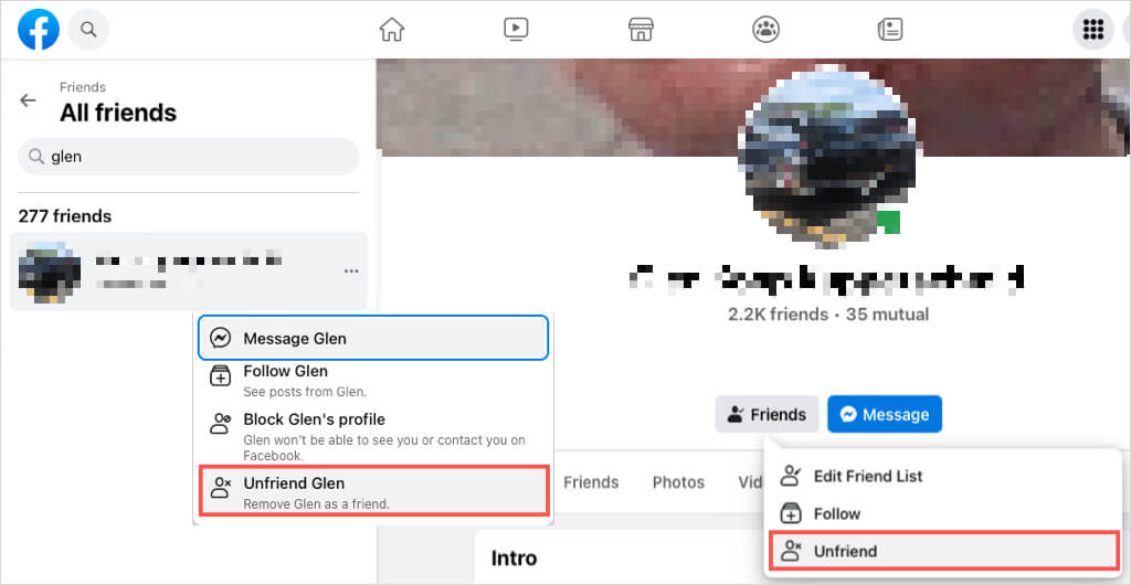 - Kattintson ahárom ponta nevüktől jobbra az oldalsávban, és válassza kiBarátság megszüntetése [név]a legördülő menüben.