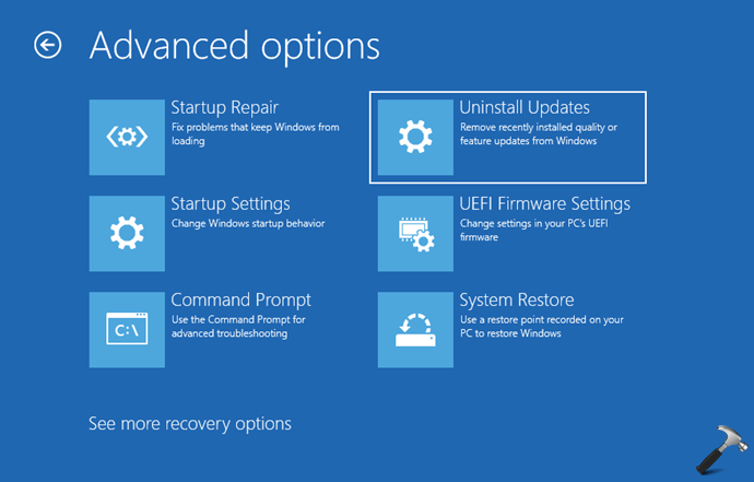 Ha nem tudja elérni a Beállítások alkalmazást, mert a rendszer nem indul el, próbálkozzon a 2. módszerrel a frissítések eltávolításához a speciális helyreállítási lehetőségek közül.