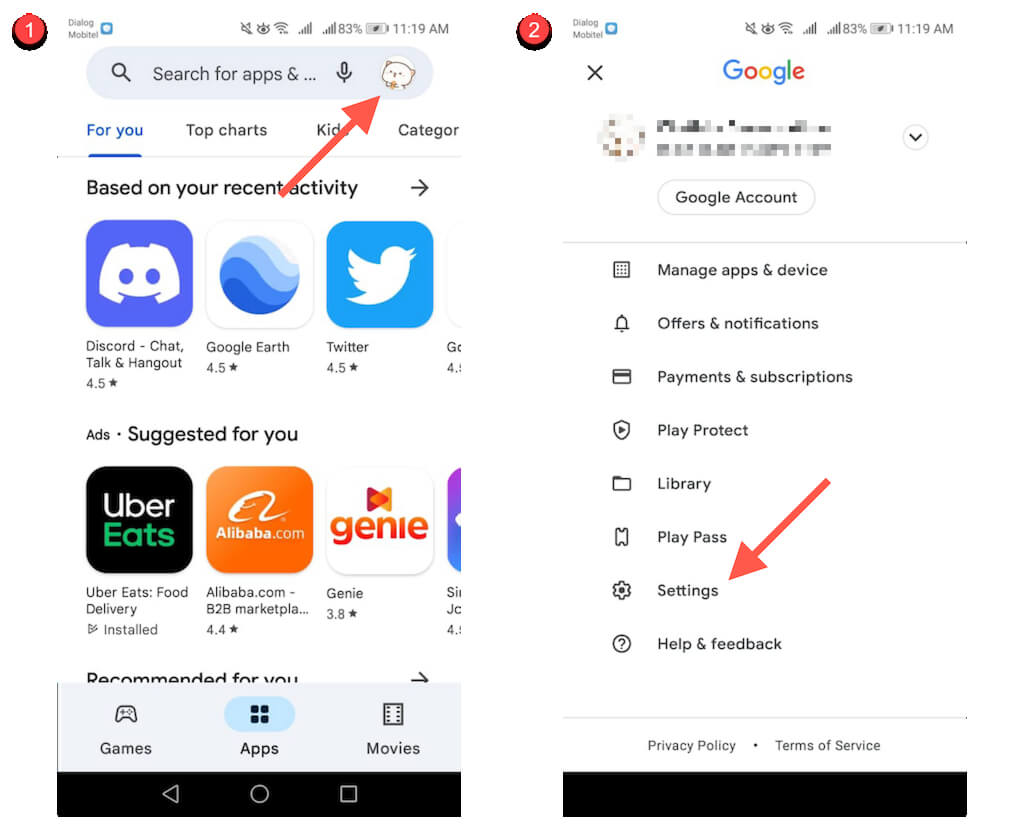 1. Érintse meg a profil ikonját a Google Play Áruház jobb felső sarkában, és válassza kiBeállítások-