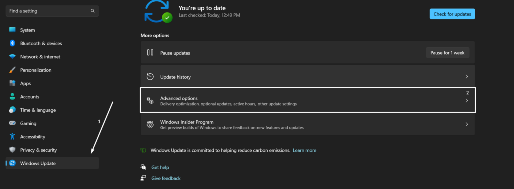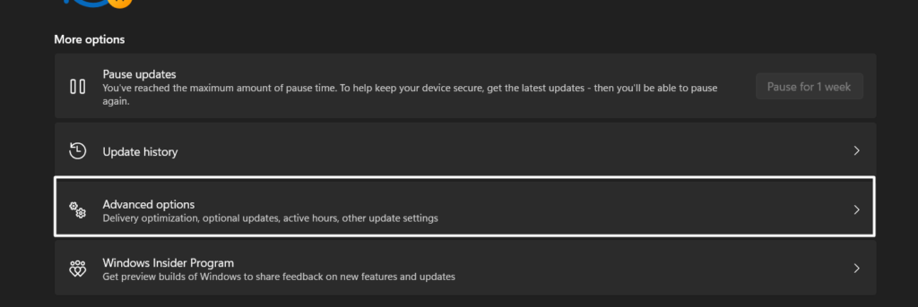 7.AWindows frissítésszakasz, kattintson a gombraHaladó lehetőségekaTovábbi lehetőségekszakasz.