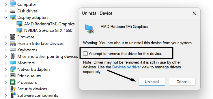 3.VálasszonTávolítsa el az eszköztA menüből és aPróbálja meg eltávolítani az eszköz illesztőprogramjátjelölőnégyzet.