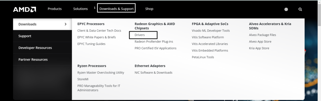 1.KattintásittNavigálni az AMD weboldalán; kattintson ráLetöltések és támogatása felső menüben, és válassza kiSofőrökaz alsó menübőlRadeon Graphics és AMD lapkakészletek-