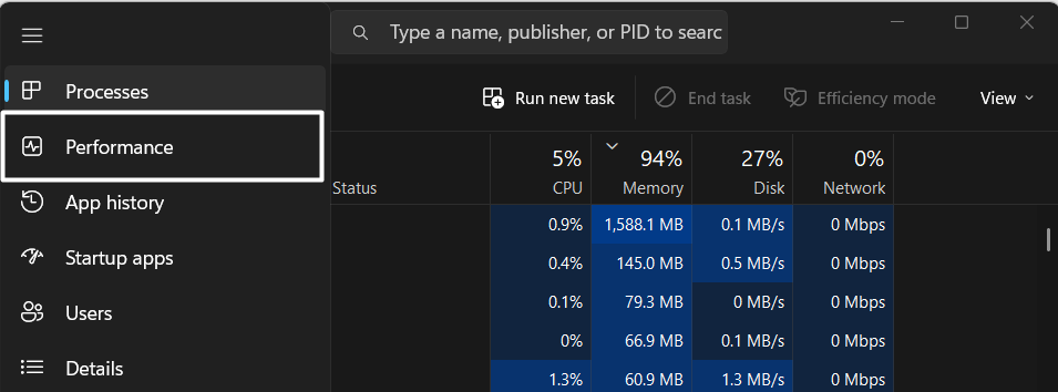 2.Kattintson a Task Manager bal felső sarkában található három vízszintes vonalra, és válassza kiTeljesítménytőle.