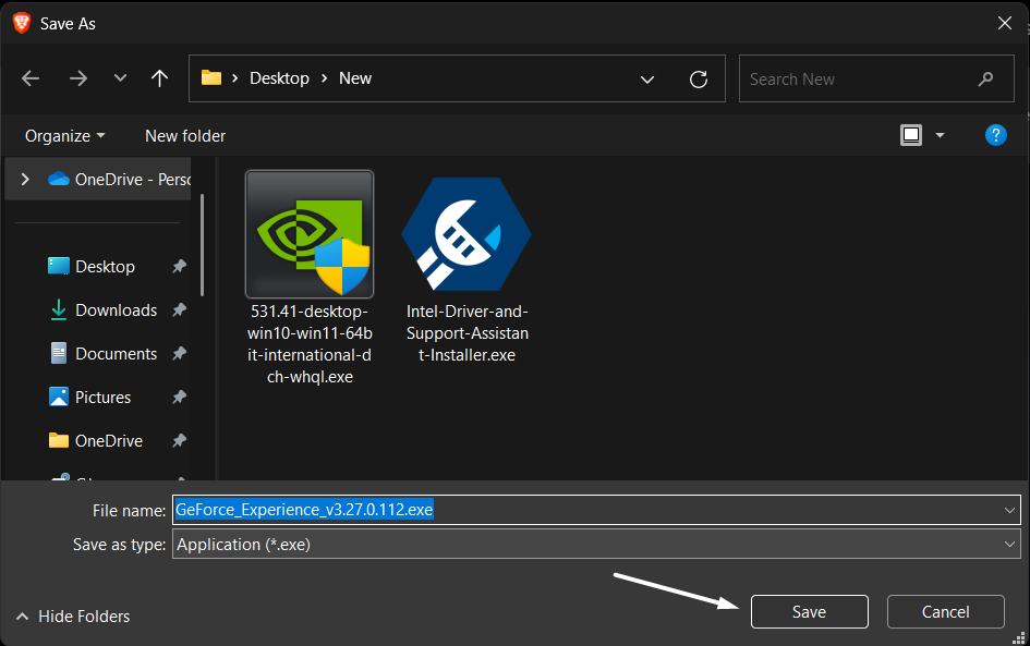 2.Kattintson aMegtakarításgomb aMentse elkérje meg, hogy mentse a GeForce Experience EXE fájlját a rendszerbe.
