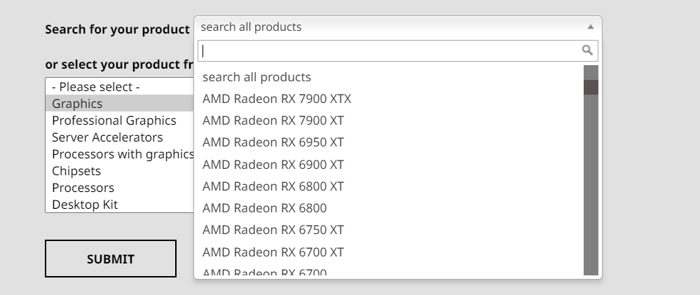 2.A következő weboldalon válassza ki az AMD grafikus kártyáját aKeresse meg a termékétlegördülő menü. Egyébként kattintson a gombraSzerezzen be illesztőprogramokat és támogatja a (grafikus kártyáját)-