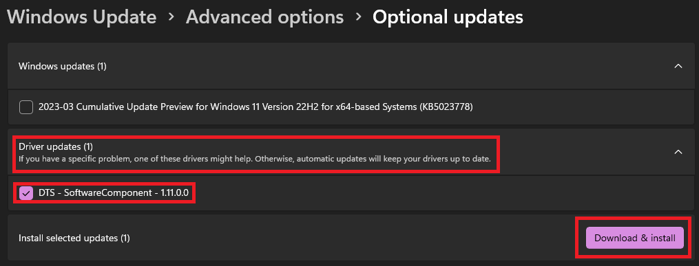5.Folytassa aOpcionális frissítésekSzakasz és ellenőrizze, hogy vannak -e új frissítések a rendszer grafikus illesztőprogramjaihozA járművezetők frissítéseiszakasz a letöltéshez és a telepítéshez.