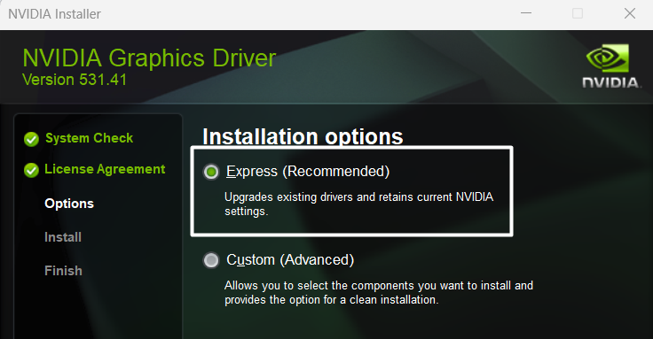 7.VálasszonExpress (ajánlott)És kattintson a KattintsonKövetkezőAz alján a vezető telepítési folyamatának megkezdéséhez. Ez eltávolítja az összes meglévő NVIDIA komponenst, és újratelepíti a frissített verzióját.